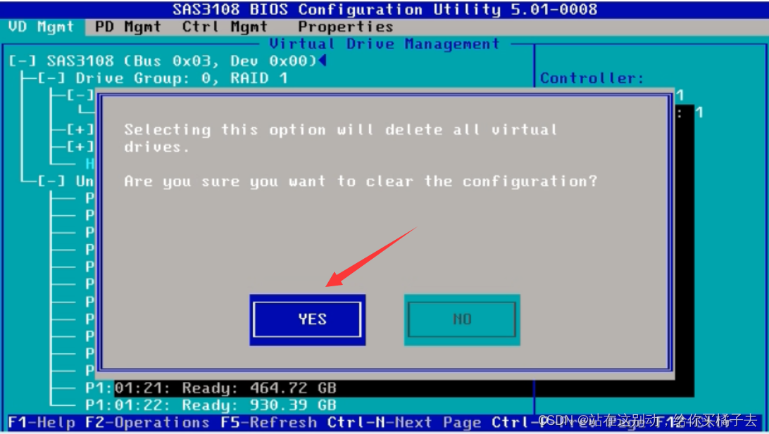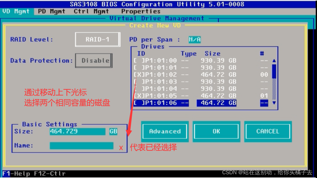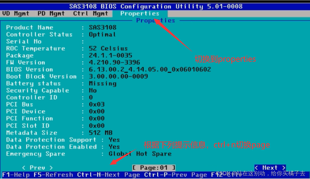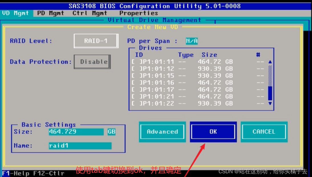 进入BIOS的界面,第一个VD Mgmt界面中,可以看到磁盘信息,也是raid设置的界面。