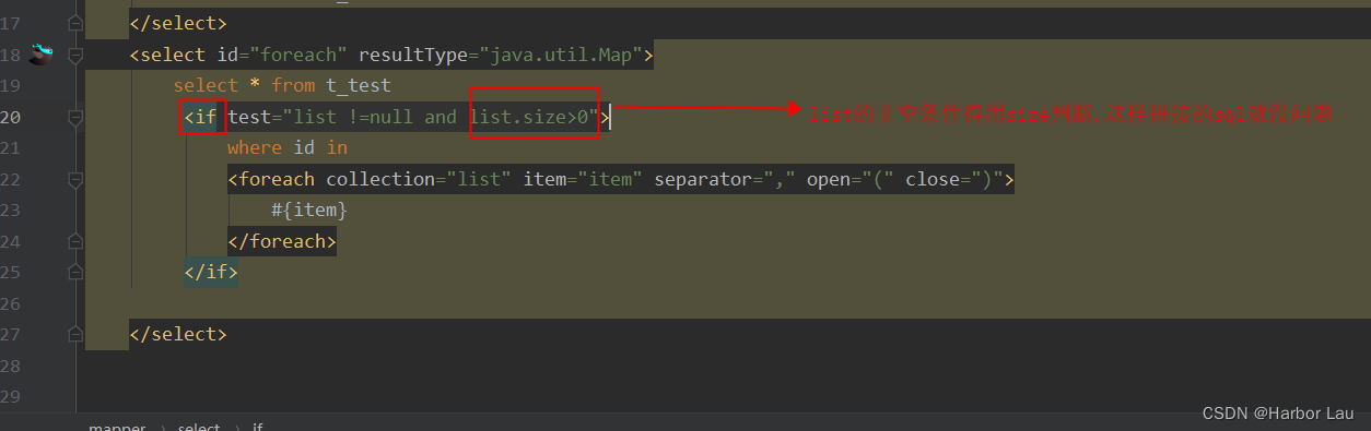 关于foreach标签传值为list的拼接条件问题,得用size来判断非空