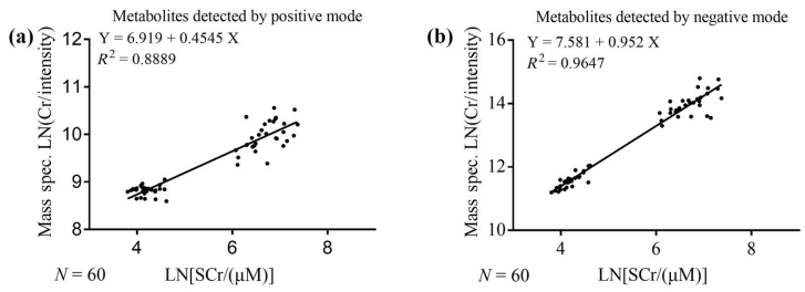 由30名尿毒症患者和30名健康组组成,进行代谢组学分析。为了检验数据的质量,我们首先分析了肌酐质量强度(Cr)与临床试验中肌酐血浆浓度之间的相关性。如图1a、b所示,在阳性模式(图1a)和阴性模式(图1b)中,肌酐强度的对数值与血浆肌酐的对数水平呈良好的线性相关(两种模式中的R值均大于0.9)。