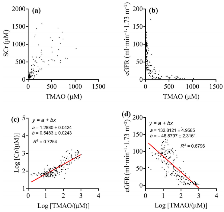 对代谢组学潜在标记物进行定量验证,N-乙酰丙氨酸、D-山梨醇和L-焦谷氨酸被排除在进一步的分析之外。为了确定CKD进展最有希望的标志物,我们对潜在标志物的血浆水平与血浆肌酐和eGFR进行了相关分析。与血浆肌酐呈正相关,与eGFR呈负相关,相关系数大于0.79(表4)。此外,血浆TMAO与血浆肌酐和eGFR的回归分析表明,血浆TMAO与肌酐和eGFR密切相关,相关系数均大于0.8(图3)。