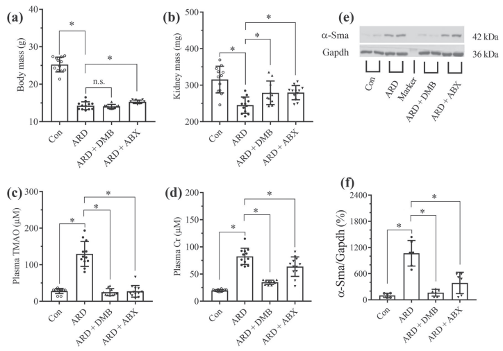 治疗前,四组小鼠的体重略有不同。与对照饮食相比,ARD饮食的消耗量显著减少。用ARD喂养小鼠可显著降低小鼠体重(图5A)和肾脏重量(图4B)。用抗生素鸡尾酒(ABX)治疗小鼠可减轻ARD诱导的小鼠体重减轻(图5A)。DMB或ABX治疗可减轻ARD引起的肾重量减少(图5b)。ARD喂养显著提高了血浆TMAO水平,而ABX或DMB处理显著降低了血浆TMAO水平(图5c)。正如预期的那样,ARD喂养显著提高了血浆肌酐水平,ABX或DMB治疗显著阻断了这一效应(图5d)。此外,ARD喂养增加了α-Sma的蛋白表达,而ABX或DMB处理会减弱α-Sma的表达(图5e,f)。相比之下,ABX或DMB治疗均未显著逆转ARD诱导的心脏质量下降。