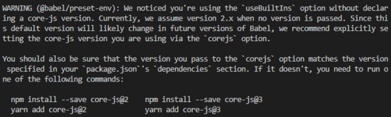 如果在执行构建时报如下警告,表示在使用 useBuiltIns 选项时没有指定 core-js 版本