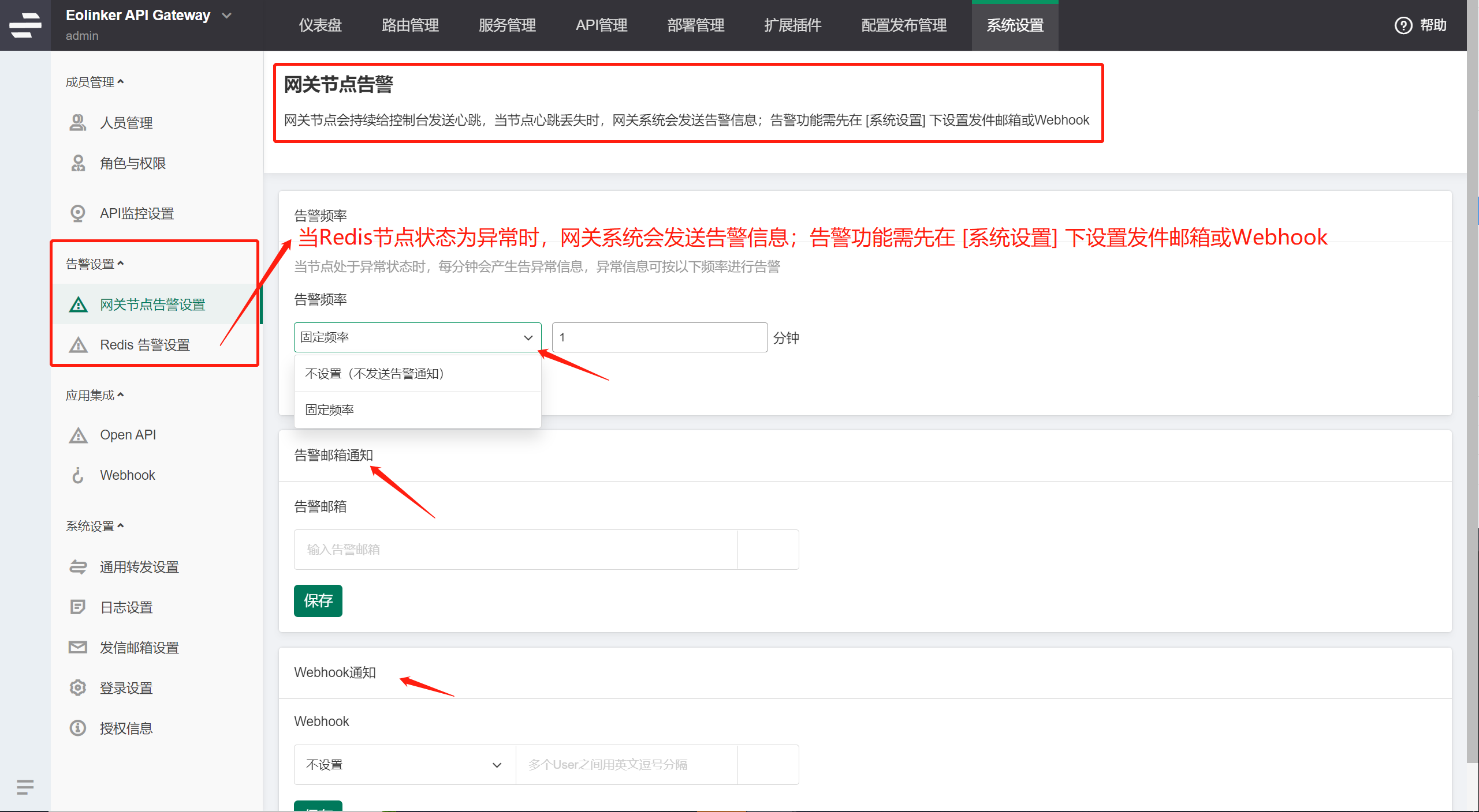 能够针对全局或单个 API 设置告警规则和具体通知的人,支持邮件和 Webhook 等告警方式,可对接企业内部告警系统。