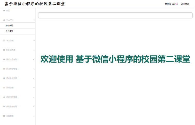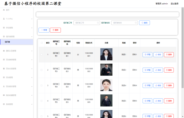 管理员:个人中心、学生管理、组织者管理、通知公告管理、活动推荐管理、活动分类管理、活动管理、活动报名管理、我的收藏管理、系统管理等