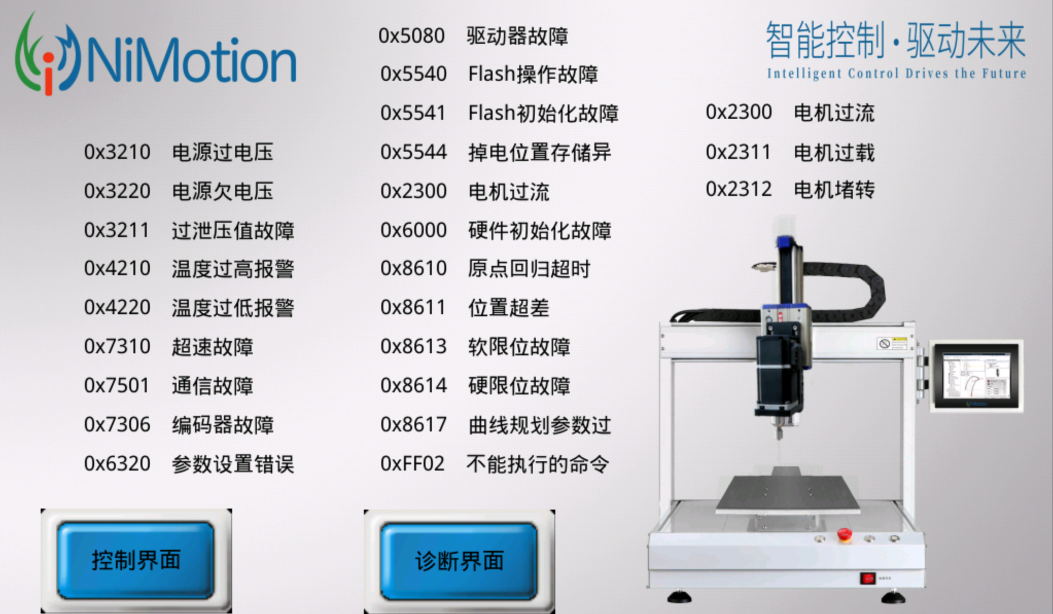界面可以实时监控当前报警码,对应故障可手动进行复位,点击报故障说明可查看报警含义,点击启动界面可返回启动界面,点击控制界面可返回控制界面。