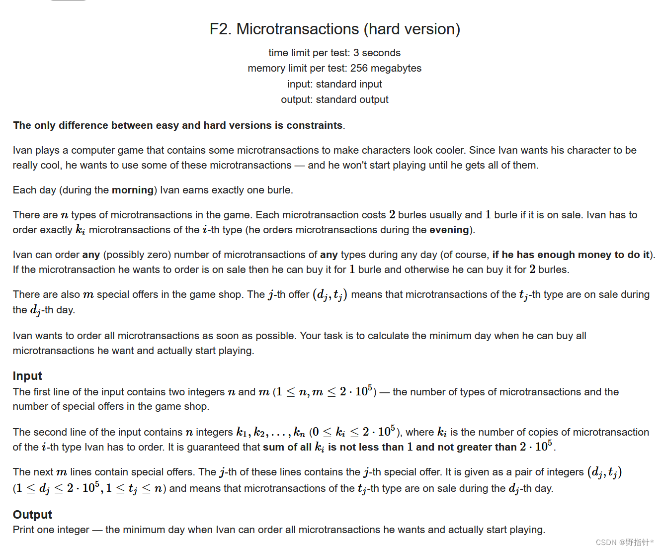 题意:有i种物品,每种物品需要买k[i]个,然后商店会有m次特价出售,第j次为在di天出售第ti种物品,物品原价2元,特价1元,你每天上午可以获得一元,下午可以进行交易,求获取所有物品花费的最少时间为多少天?