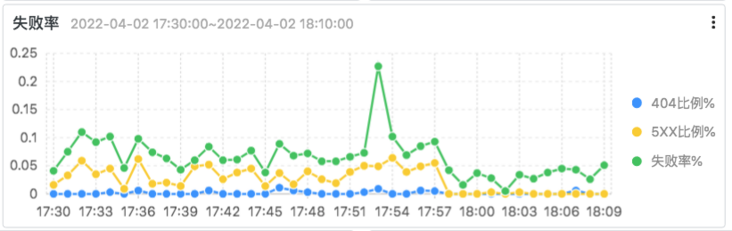 从ingress的监控中心,我们看到,失败率虽然不高,但始终保持在0.05到0.1的水平: