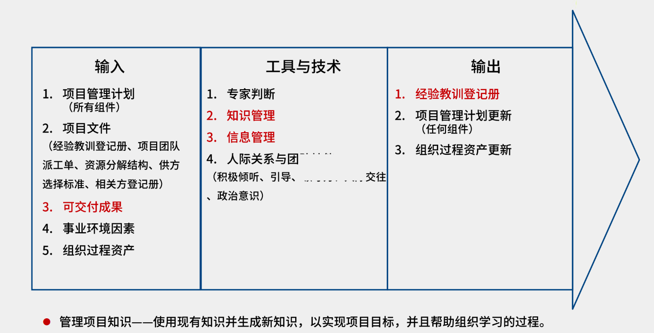 管理项目知识是使用现有知识并生成新知识,以实现项目目标,并且帮助组织学习的过程。本过程的主要作用是,利用已有的组织知识来创造或改进项目成果,并且使当前项目创造的知识可用于支持组织运营和未来的项目或阶段。本过程需要在整个项目期间开展。