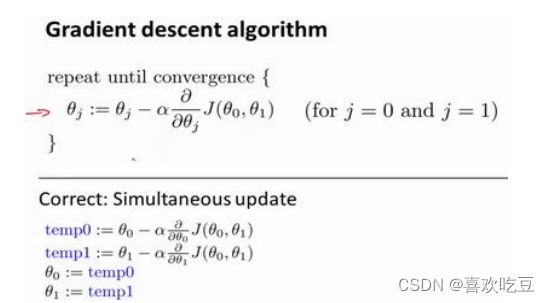 梯度下降是一个用来求函数最小值的算法,我们将使用梯度下降算法来求出代价函数𝐽(𝜃0