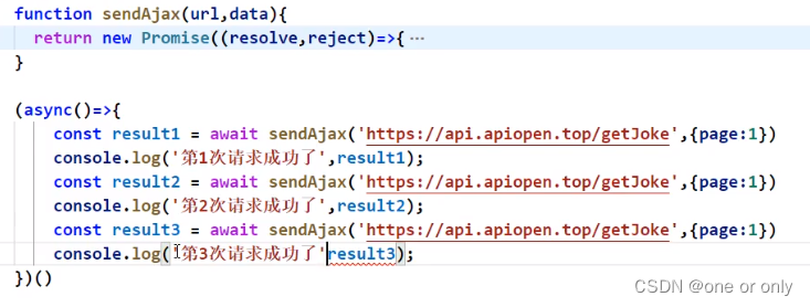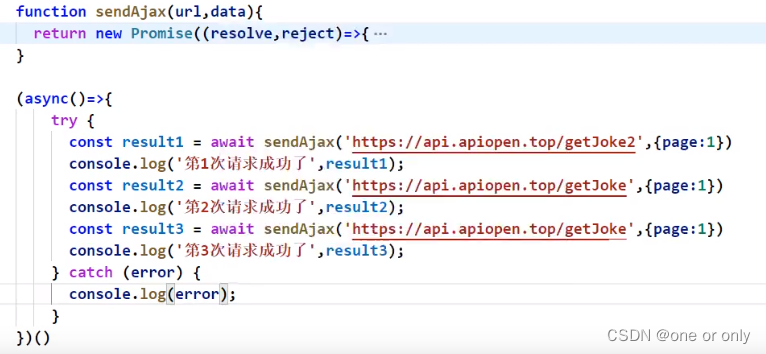 // 函数形式写法 async function demo() { try { const result = await promiseAjax(url); console.log(result); console.log(100); } catch (error) { console.log(error); } } demo(); // 箭头函数形式写法 // 注意:如果前面没分号,需要在函数前面加分号或者感叹号,否则会报错。 (async () => { try { const result = await promiseAjax(url); console.log(result); console.log(100); } catch (error) { console.log(error); } })()