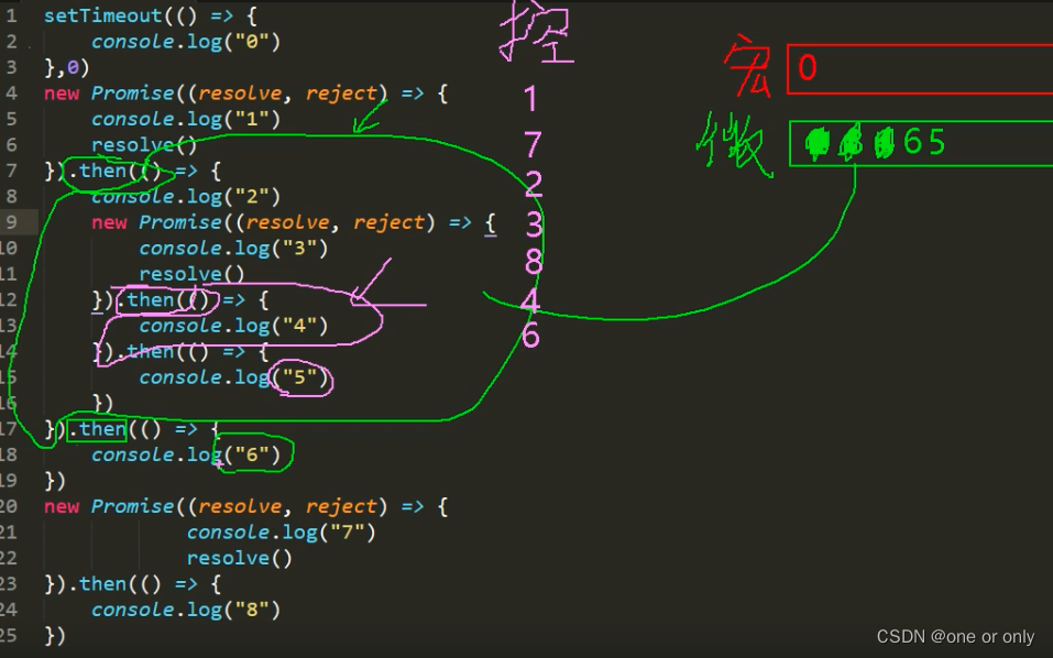 执行结果:微任务先执行:成功了3;成功了4;宏任务执行:间隔3秒的 timeout2 先执行,间隔5s的 timeout1 再执行,然后将 timeout3推入宏任务,再将成功了5 推入微任务。微任务先执行成功了5,然后执行宏任务timeout3。