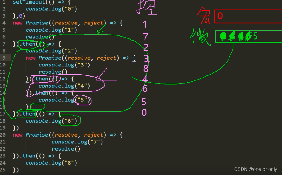 宏队列:用来保存待执行的宏任务(回调),比如:定时器回调、DOM 事件回调、ajax 回调。微队列:用来保存待执行的微任务(回调),比如:promise 的回调、MutationObserver 的回调。目前接触到的微任务就只有Promise的回调。