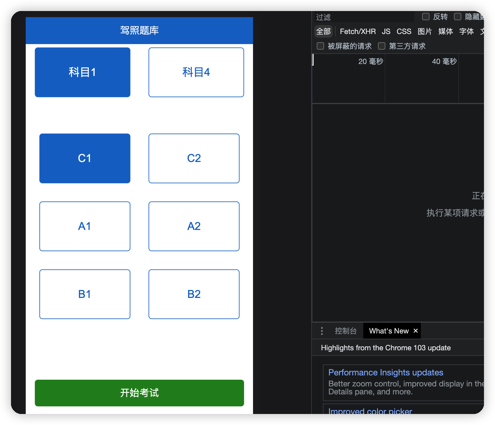 之前做一个驾照考题的项目,有一个这样的问题,每当我选好了科目和驾照类型后(如图1),点击开始考试就会跳到考试页面(Test.tsx),并且在Test组件中对我架设的中间层发起请求获取数据(如图2)。