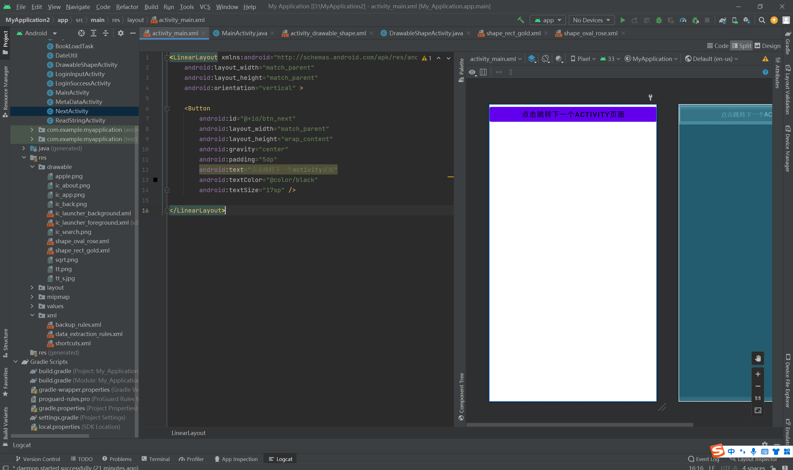- android:text="点击跳转下一个activity页面"
