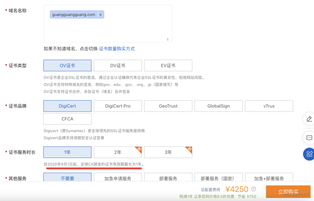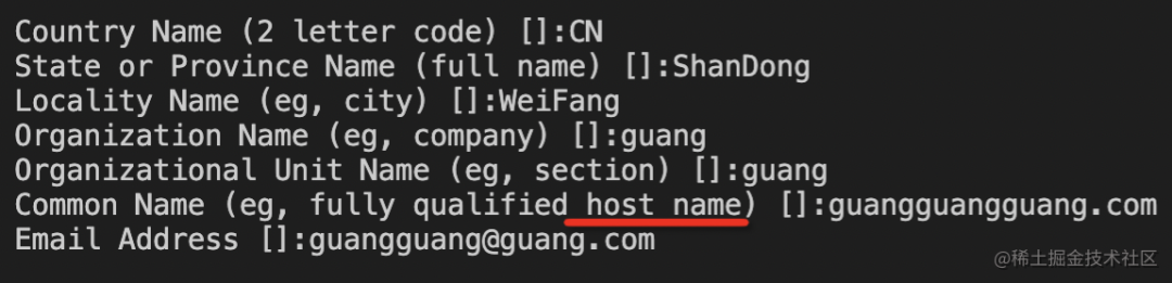 这个过程中要输入一些信息,最重要的是域名信息,因为证书就是为了证明公钥是这个域名的: