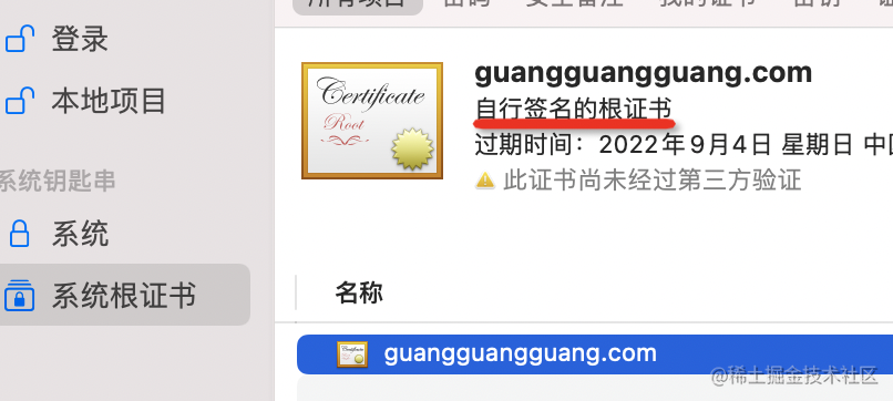 导入 ca-cert.pem,就可以在钥匙串中找到 guangguangguang.com 的根证书,已经标记了是自签名证书: