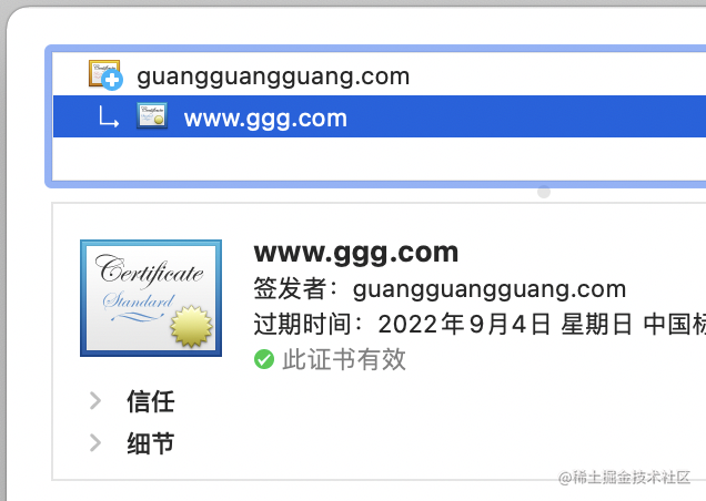 会看到只有一级 www.ggg.com 的证书,还没有被信任。