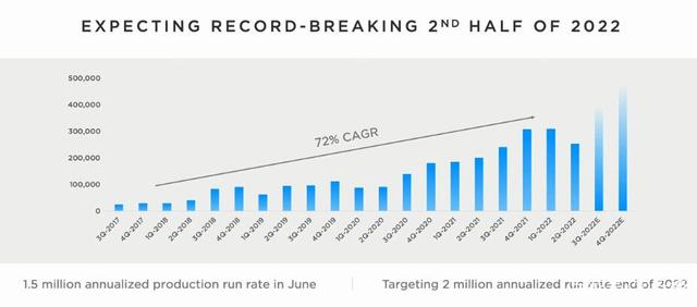 2022上半年,我们已经交付了超过50万辆汽车(2022年上半年,特斯拉交付56.4万辆汽车),根据今年剩下的时间预估,我们认为我们可能会接近或者超过150万辆销量目标,并在年底前达成200万辆。