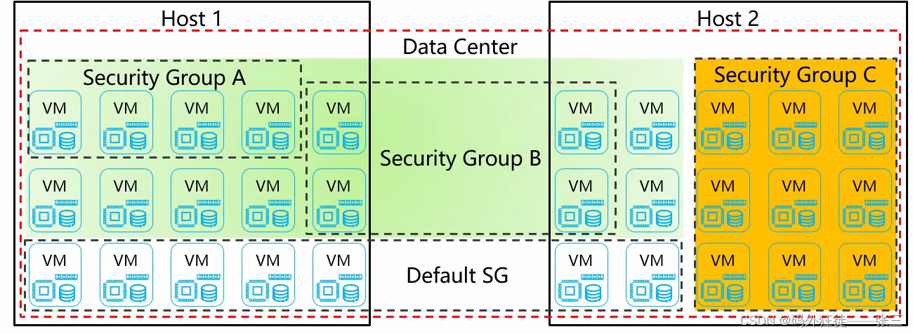 - 用户根据虚拟机安全需求创建安全组,每个安全组可设定一组访问规则。当虚拟机加入安全组后,即受到该访问规则组的保护。用户通过在创建虚拟机时选定要加入的安全组来对自生的虚拟机进行安全隔离和访问控制