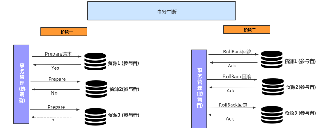 - 中断事务:协调者接收到所有参与者反馈的 Ack 信息后,完成事务中断。