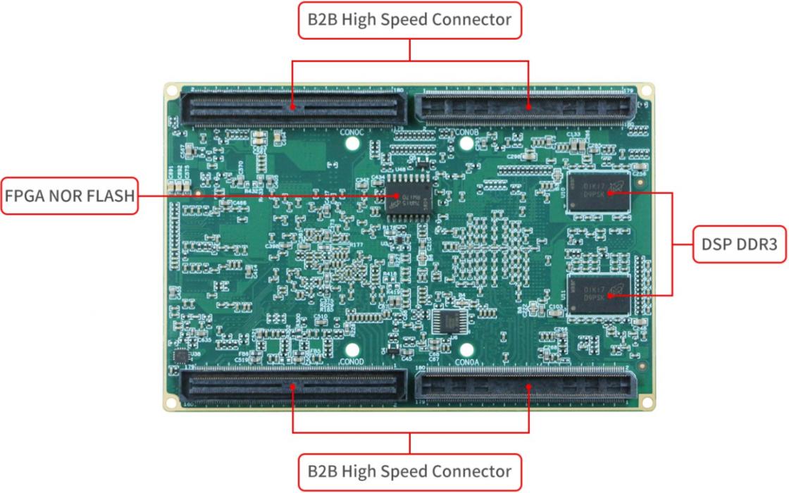 SOM-TL6678F核心板板载DSP、FPGA、CPLD、ROM、RAM、晶振、电源、LED等硬件资源,并通过工业级高速B2B连接器引出IO。