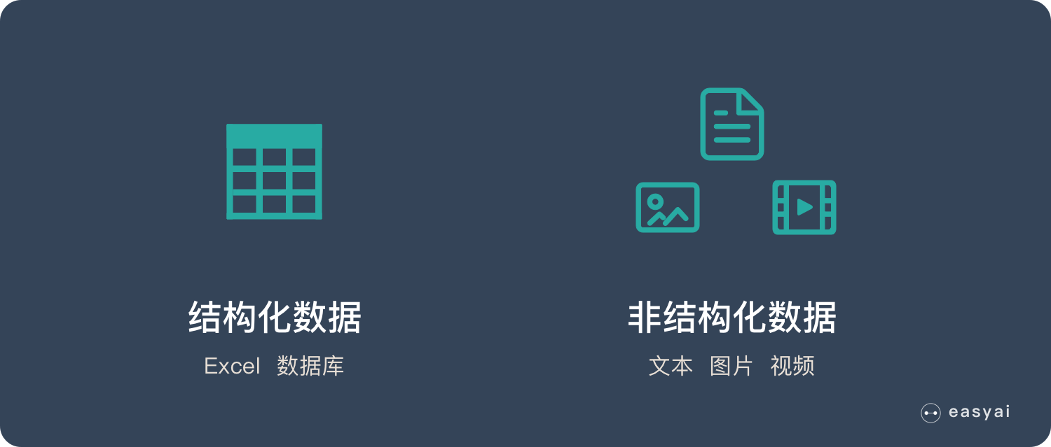 在人工智能出现之前,机器智能处理结构化的数据(例如 Excel 里的数据)。但是网络中大部分的数据都是非结构化的,例如:文章、图片、音频、视频…