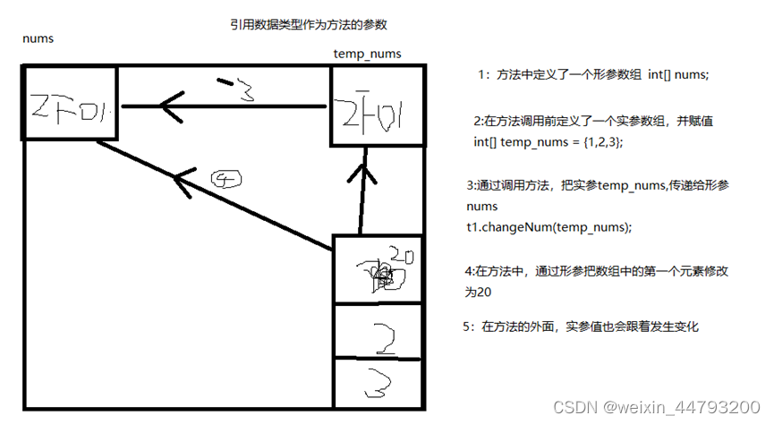 结论:在引用数据类型作为方法参数的时候,形参的任何改变会影响实参的结果(注意如果在方法中对于形参重新分配了空间如 nums = new int[3];person=new Person())则形参的变化不会影响到实参的值)