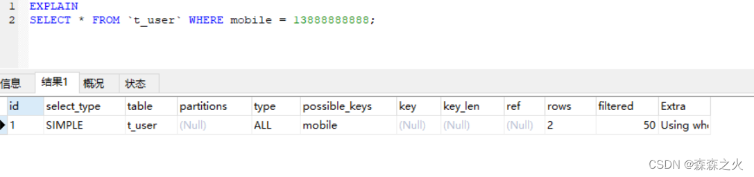 本例子中的mobile 字段类型varchar类型,如果查询语句这么写,