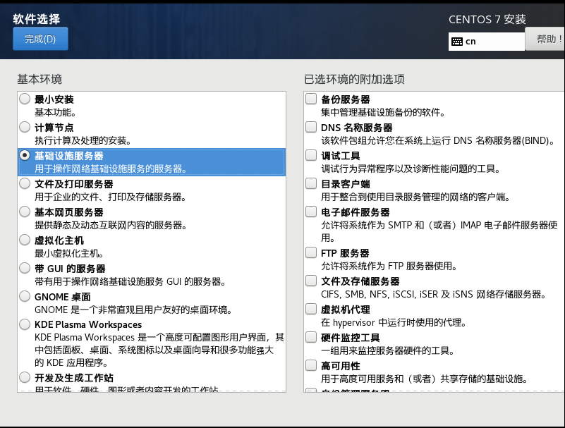23、软件选择:我这里选择安装基础设施服务器,安装后的系统没有图形化界面,想要图形化界面的同学可以选择“安装带GUI的服务器”这一个选项