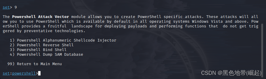 如果目标主机没有运行Java, 则不能欺骗它访问攻击主机社会工程学的页面,将不能进行攻击。需要使用其他方法, 即向目标主机发送病毒文件。使用PowerShell攻击向量可以创建PowerShell文件, 并将创建好的文件发送给目标。当目标运行时, 就可以获取一个远程连接