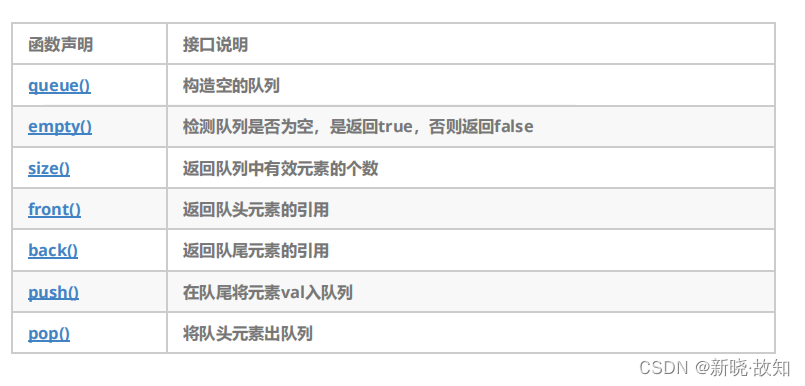 queue的文档介绍链接: queue - C++ Reference翻译:1. 队列是一种容器适配器,专门用于在FIFO上下文(先进先出)中操作,其中从容器一端插入元素,另一端提取元素。2. 队列作为容器适配器实现,容器适配器即将特定容器类封装作为其底层容器类,queue提供一组特定的成员函数来访问其元素。元素从队尾入队列,从队头出队列。3. 底层容器可以是标准容器类模板之一,也可以是其他专门设计的容器类。该底层容器应至少支持以下操作:empty:检测队列是否为空size:返回队列中有效元素的个数front:返回队头元素的引用back:返回队尾元素的引用push_back:在队列尾部入队列pop_front:在队列头部出队列4. 标准容器类deque和list满足了这些要求。默认情况下,如果没有为queue实例化指定容器类,则使用标准容器deque。![]()