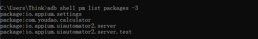 (3)appPackage : 测试APP的包名 获取方式 可输入:adb shell pm list packages -3 查看包名,测试包名:com.youdao.calculator