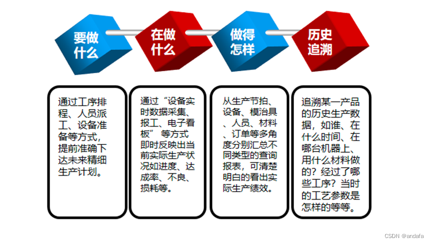 安达发MES拥有18个核心功能:1.供应商来料条形码化2. 生产计划与排程 3.生产批次定义4. 生产派工5.电子SOP作业指导书6.工位投料、工序投料7.按灯呼叫8.数控程序下发与上传9.设备监控与自动化数据采集10.工位测试11.工序报工、返修、移转12.不良品维修、处理、报废13.条码化包装14.电子看板15.追溯管理16.生产绩效工资。