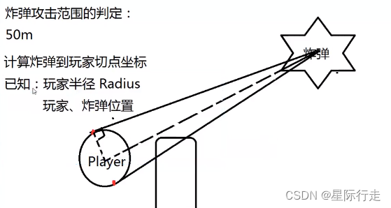 计算出两个切点坐标后,计算两切线是否与障碍物相交,即可判定玩家是否被炸伤。