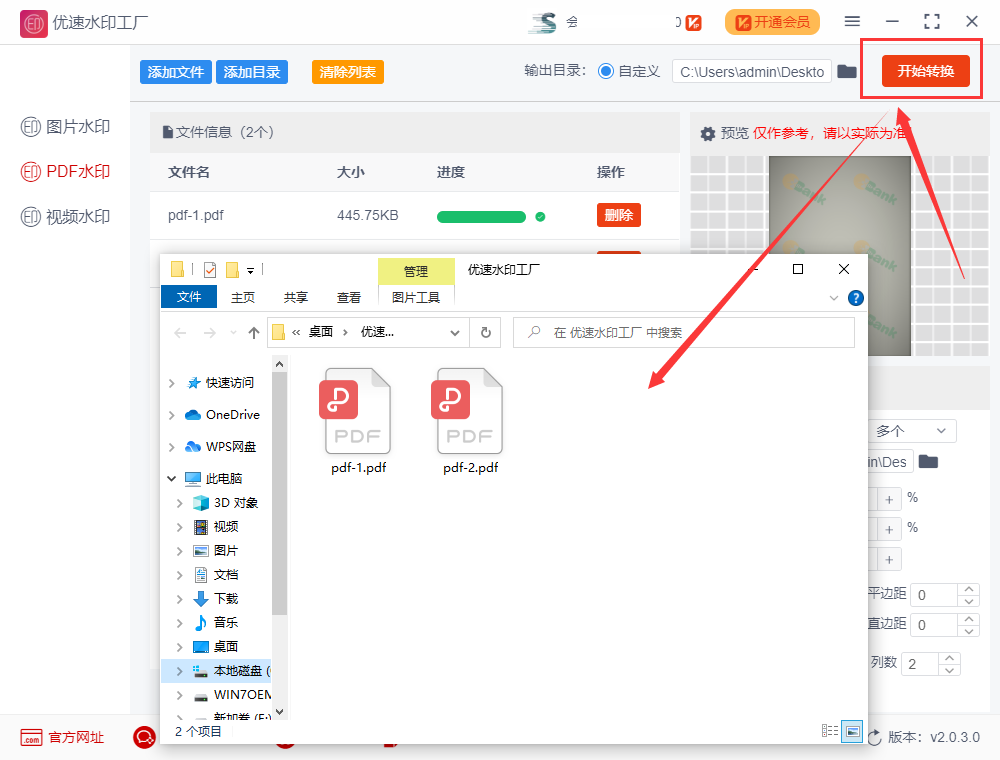 点击软件右上角的【开始转换】红色按钮,启动软件程序,当所有pdf文件加好水印之后软件会自动弹出输出文件夹,方便我们随时查看加好水印的pdf文件,不需要再查找。