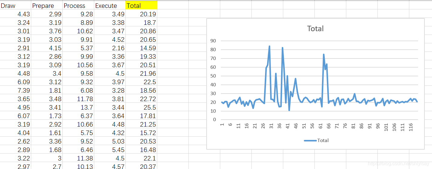 Draw + Prepare+Process + Execute = 绘制一帧需要的时间 ,这个时间要小于16.67ms才能保证每秒60帧,即fps为60;如果超过了16.67就表示掉帧了。