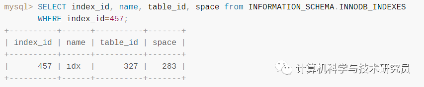 如上图所示,创建一个数据表opening_lines,其中文本类型字段opening_line声明为支持全文检索的索引。使用MySQL的系统表INNODB_TABLES查询数据表opening_line对应的倒排索引的相关表,其中opening_lines的数据表ID等于327,对应的16进制数值是0x147,opening_lines数据表中的索引字段idx对应的索引ID等于457,对应的16进制数值是0x1c9,由此可知,倒排索引的6个数据表的名称中包括数据表ID与索引ID的16进制数值。用户可以使用如下的SQL查询系统表中的索引信息: