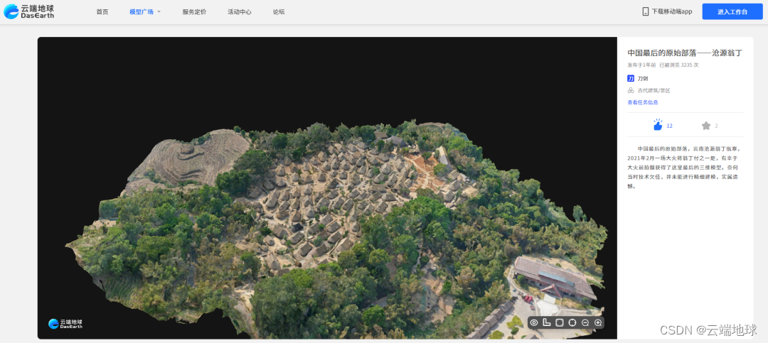 利用实景三维可视化技术让现实世界的传统文物、古建筑群在数字世界得以重建出来,在云端地球上,你甚至能利用三维模型一览翁丁佤寨的全貌。