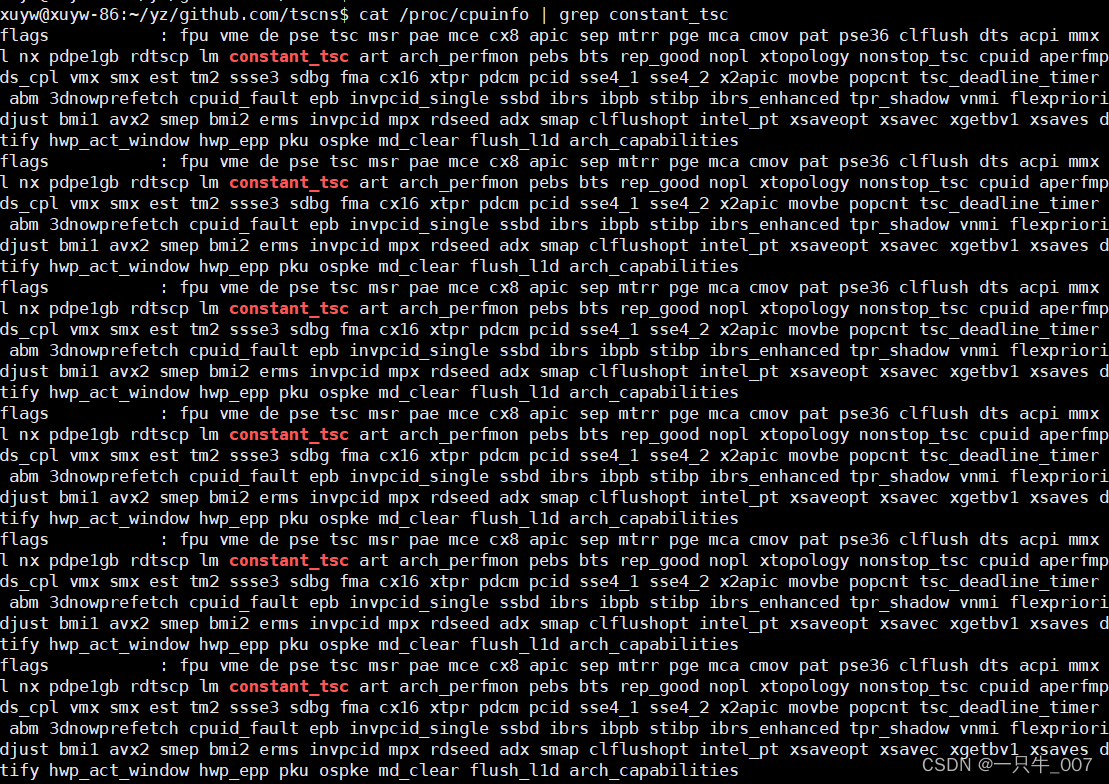 在较新版本的CPU中,引入了常量速率TSC的特性(constant rate TSC)。可以通过如下命令查看你的CPU是否支持(我的机器有四个核,因此输出了四条):