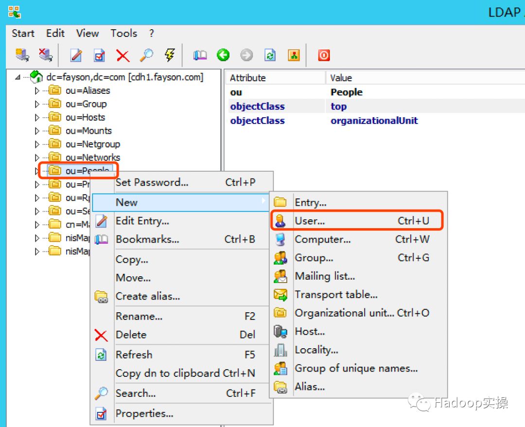 1.通过LDAP Admin工具在ou=People下创建一个用户,选中该OU点击右键
