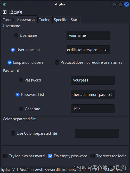 可以使用Kali系统中存在的用户名和密码列表文件, 并选择Loop around users 选项