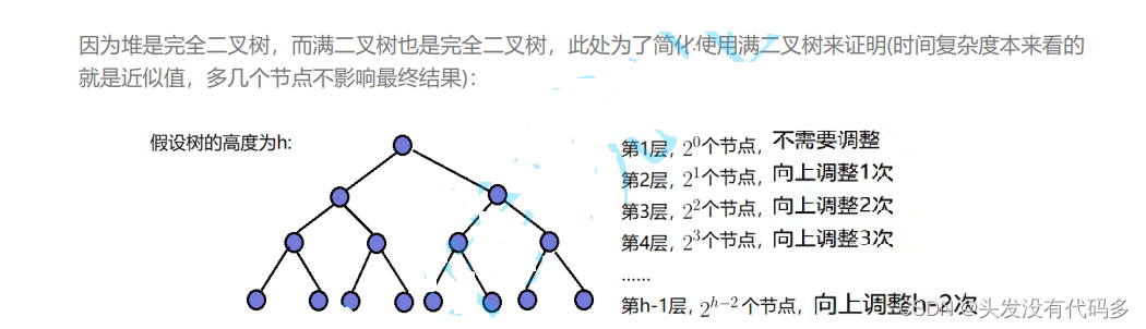 当满二叉树节点较多时,最后一层节点的个数约为总结点个数的一半,向下调整的好处:节点所在层数越小(以第1层为比较基准),调整次数越多,节点所在层数越大,此时节点越多,调整次数越小