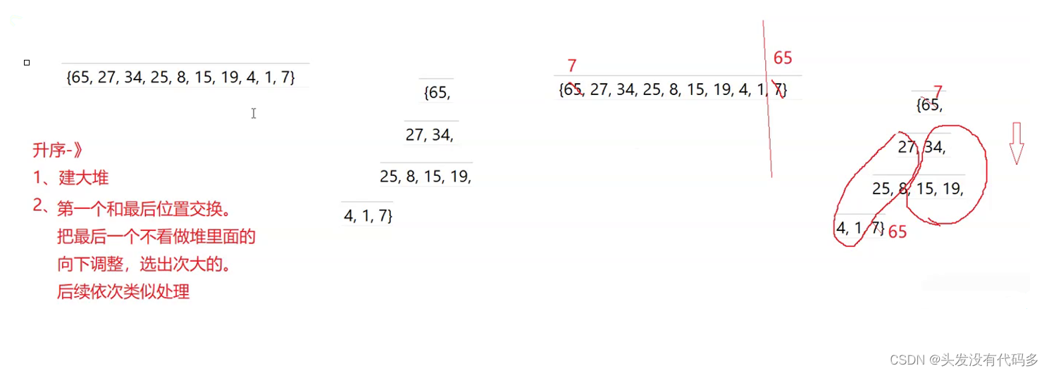 //建堆——向下调整建堆 for (int i = (n - 1 - 1) / 2; i >= 0; --i) //n-1是最后一个节点,(n-1-1)/2是最后一个节点的父节点 //物理上操作数组,逻辑上在操作堆 { AdjusuDown(a, n, i); }