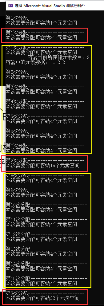可以看到每次分配的内存空间均为上次的1.5倍,这也是VS编译器所采取的策略。
