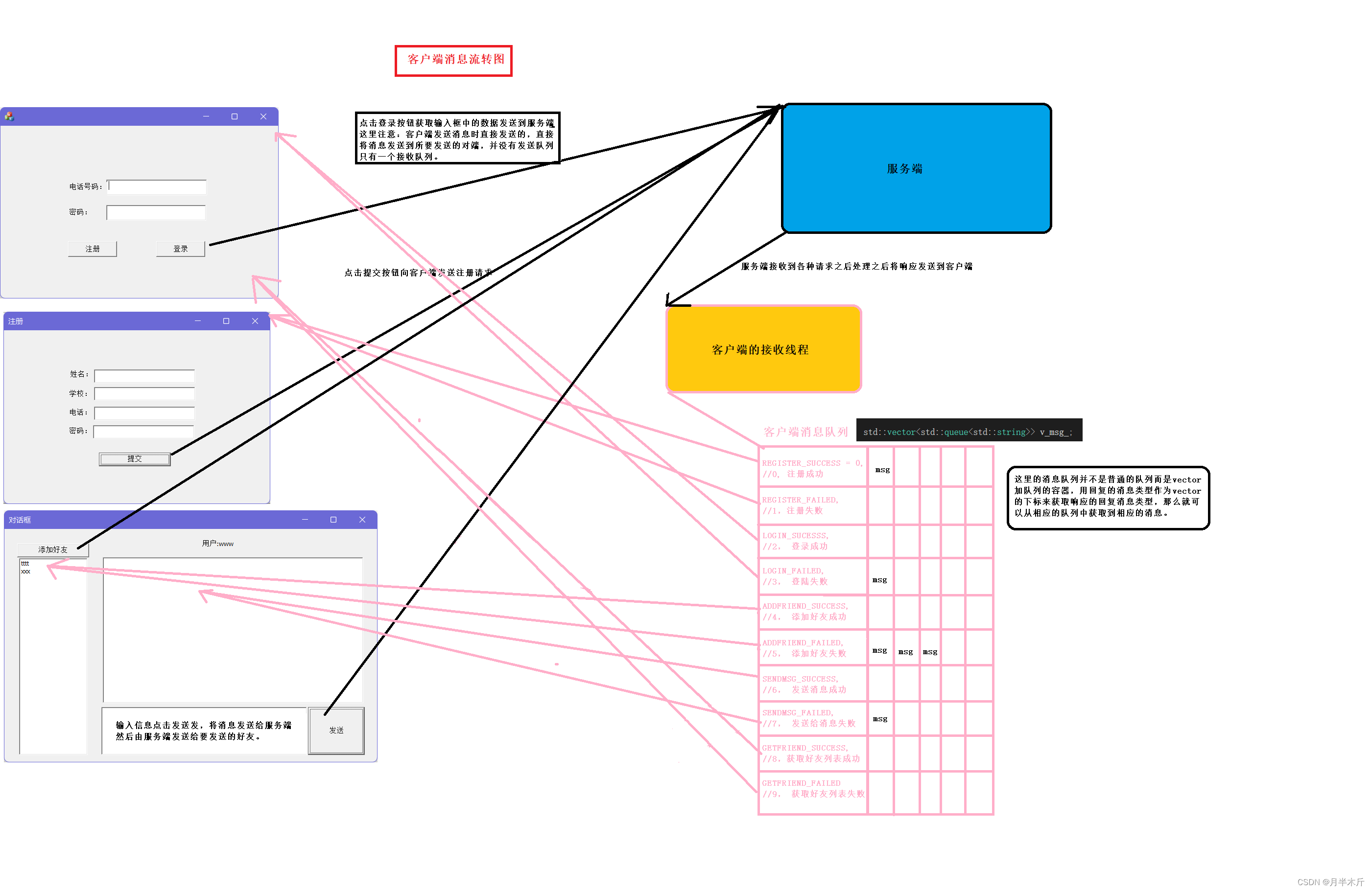 客户端这里我们用到了MFC编程:关于MFC在b站上的黑马程序员讲解的特别容易理解,这里就不多赘述了,可以去学习一下。这里给出客户端消息流转图: