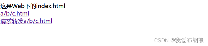 我们上面生成了两个页面,当我们通过点击每个页面的第一个超链接(a标签)的时候,可以实现两个页面的相互跳跃,但是当我们点击“请求转发a/b/c.html”此超链接进项相互跳跃的时候,我们发现可以跳过去,但是跳不回来,那原因是什么呢?