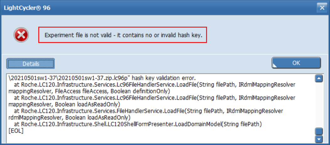 [2022-08-09 22:17:28,953][ERROR][Logger:Roche.LC120.Infrastructure.Shell.LC120ShellFormPresenter][Thread:1][Source:LC120ShellFormPresenter.HandleFileLoadingException:0] Error while loading file "D:\Minuy\Desktop\20210501sw1-37\20210501sw1-37.zip.lc96p". Roche.LC120.Infrastructure.Interface.Exceptions.InvalidHashKeyException: Lc96 file "D:\Minuy\Desktop\20210501sw1-37\20210501sw1-37.zip.lc96p" hash key validation error.