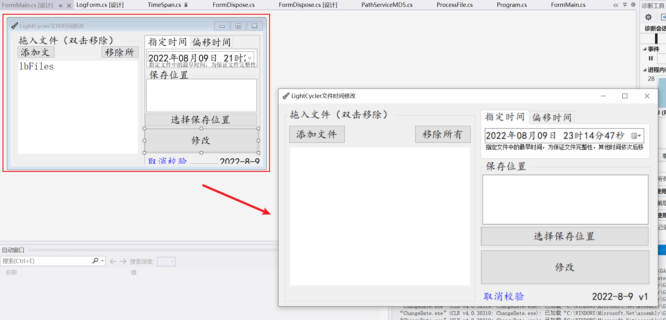 经过一天的开发,基本功能算是完成了, 左边是添加文件的地方,可以拖放,也可以选择。右边上面是调整时间的地方,调整到你需要修改的时间,不能每个时间都精确,只能总体偏移,上次乱调时间遇到了个堆栈溢出打不开的情况。右边中间是保存的位置,可以选择也可以直接输入。右边下面是操作栏,其中的取消验证就是替换一下我反汇编之后的那个dll,修改是直接执行修改,现在能实现批量修改了。下面的版本号点击进去是一个日志和关于界面,软件出现的问题基本上可以从这里查到。点击修改之后会弹出个面板,里面详细记录了修改的过程。