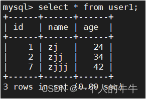 insert into user values (1,'zj',24),(2,'zjj',34),(7,'zjjj',42);