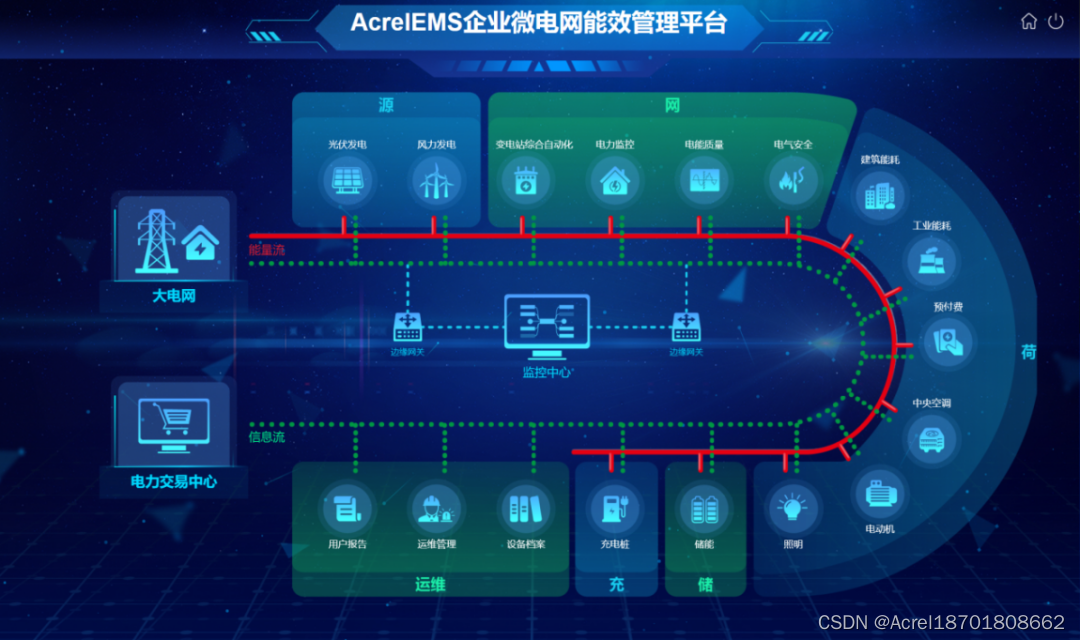 AcrelEMS企业微电网能效管理平台通过在企业微电网源、网、荷、储、充的各个关键节点安装计量和分析装置,搭建三级计量体系,用于监测企业能耗总量和能耗强度,从而诊断低能效环节。平台根据最新的电网价格、用电负荷、电网调度指令等情况,调整能源使用策略,优先使用绿色能源,使企业微电网始终高效稳定运行,快速响应电网需求,实现能源